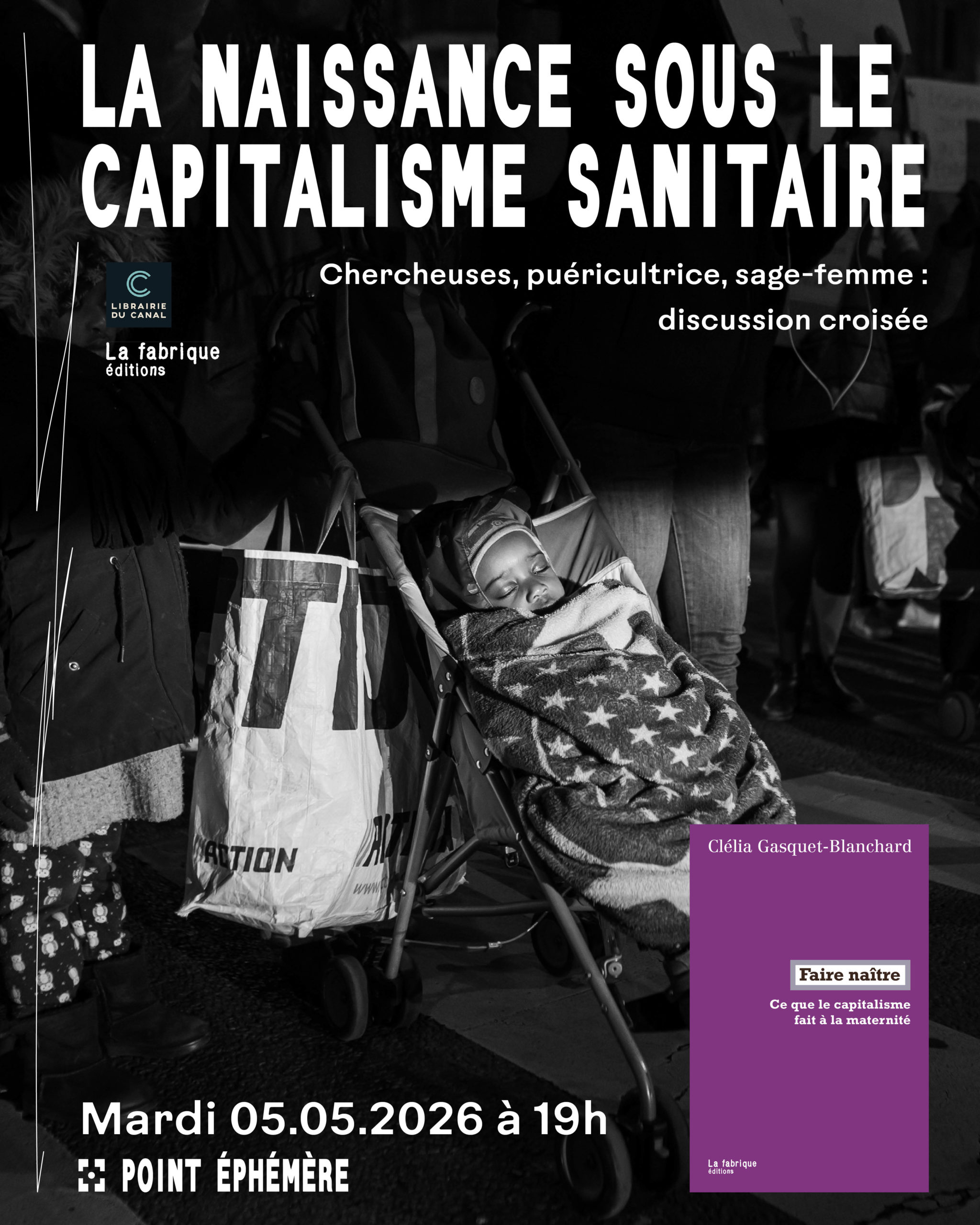 La naissance sous le capitalisme sanitaire. Chercheuses, puéricultrice, sage-femme : discussion croisée avec Clélia Gasquet-Blanchard (Faire naître), Chiara Bigazzi et Maria Iasagkasvili mardi 5 mai 2026 à 19h30 au Point Éphémère (200 Quai de Valmy, 75010 Paris), en partenariat avec la librairie du Canal.