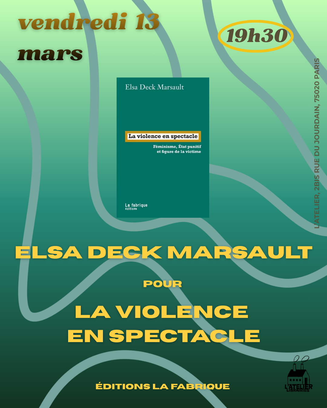 Elsa Deck Marsault présente son ouvrage La violence en spectacle vendredi 13 mars 2026 à 19h30 à la librairie l’Atelier (2bis, rue du Jourdain, 75020 Paris).