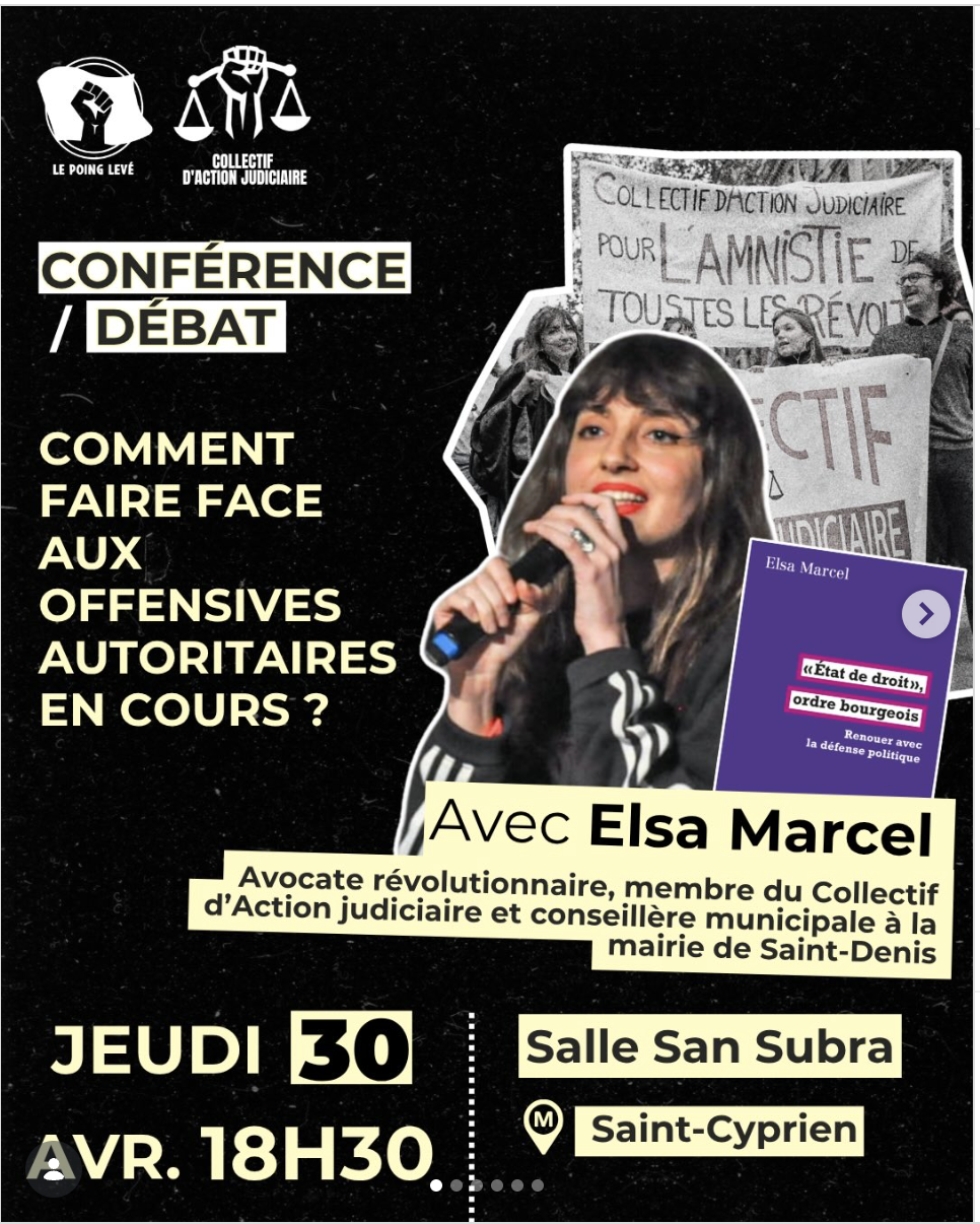 Conférence « Comment faire face aux offensives autoritaires en cours ? » avec Elsa Marcel (« État de droit », ordre bourgeois) jeudi 30 avril 2026 à 18h à la salle San Subra (2 Rue San Subra, 31300 Toulouse).