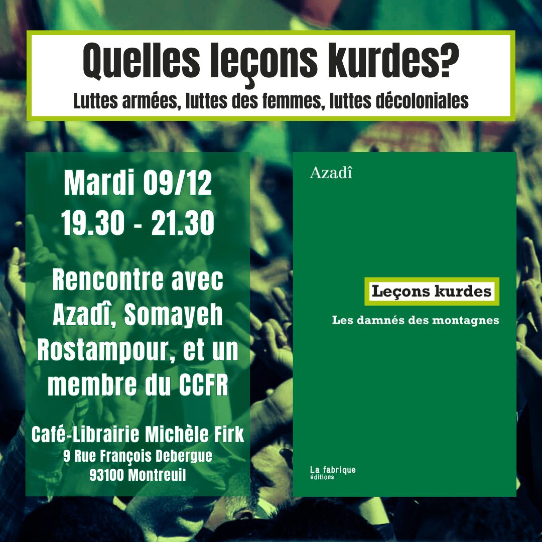 Rencontre organisée par la librairie Michèle Firk avec Azadî (Leçons kurdes) mardi 9 décembre 2026 à 19h30 à la Parole errante (9 Rue François Debergue, 93100 Montreuil).